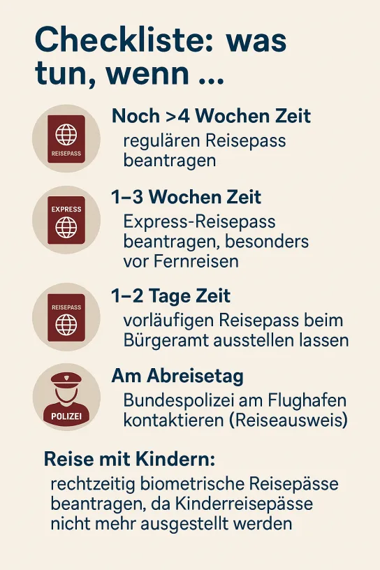 Ein abgelaufener oder verschwundener Reisepass kurz vor der Abreise muss nicht automatisch das Aus für den Urlaub bedeuten. In diesem Ratgeber erfahren Sie umfassend, welche Möglichkeiten es gibt, um dennoch zu verreisen. Wir erklären die aktuellen Einreisebestimmungen (EU und Nicht-EU, inklusive Großbritannien, Türkei, USA), stellen Ersatzdokumente und Express-Verfahren vor und geben hilfreiche Tipps zu neuen digitalen Services. Außerdem finden Sie Checklisten, Hinweise für Reisen mit Kindern sowie Ratschläge, wie Sie im Notfall richtig reagieren.